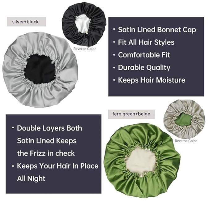 Indulge in luxurious comfort and practicality with our innovative 2-in-1 Satin Shower Cap and Sleep Bonnet 2 Pack Set. Designed to revolutionize your hair care routine, this versatile accessory effortlessly combines style, functionality, and durability. Crafted from two premium quality materials: washable satin waterproof outer layer and a luxurious satin inner layer, our shower cap and sleep bonnet duo is meticulously engineered to protect your hair while you sleep and during your daily bathing rituals. The friction-free satin gently cradles your locks, preventing frizz, breakage, and tangles, ensuring your hair retains its natural shine and vitality.