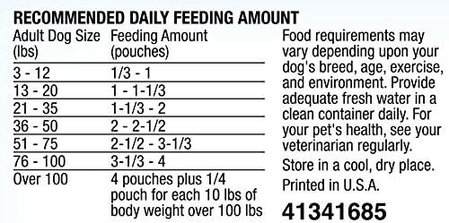 Amounts are recommended for an average adult dog with normal activity. Remember food intake requirements vary depending on age, activity, and environment, and should be adjusted accordingly. RECOMMENDED DAILY FEEDING AMOUNT Adult Dog Size (lbs) 3-12 Feeding Amount (pouches) 1/3 to 1, Adult Dog Size (lbs) 13 – 20 Feeding Amount (pouches) 1 to 1-1/3, Adult Dog Size (lbs) 21 – 35 Feeding Amount (pouches) 1-1/3 to 2, Adult Dog Size (lbs) 36 – 50 Feeding Amount (pouches) 2 to 2-1/2, Adult Dog Size (lbs) 51 – 75 Feeding Amount (pouches) 2-1/2 to 3-1/3, Adult Dog Size (lbs) 76 -100 Feeding Amount (pouches) 3-1/3 to 4, Adult Dog Size (lbs) Over 100 Feeding Amount (pouches) 4 pouches plus 1/4 pouch for every 10 lbs of body weight over 100 lbs