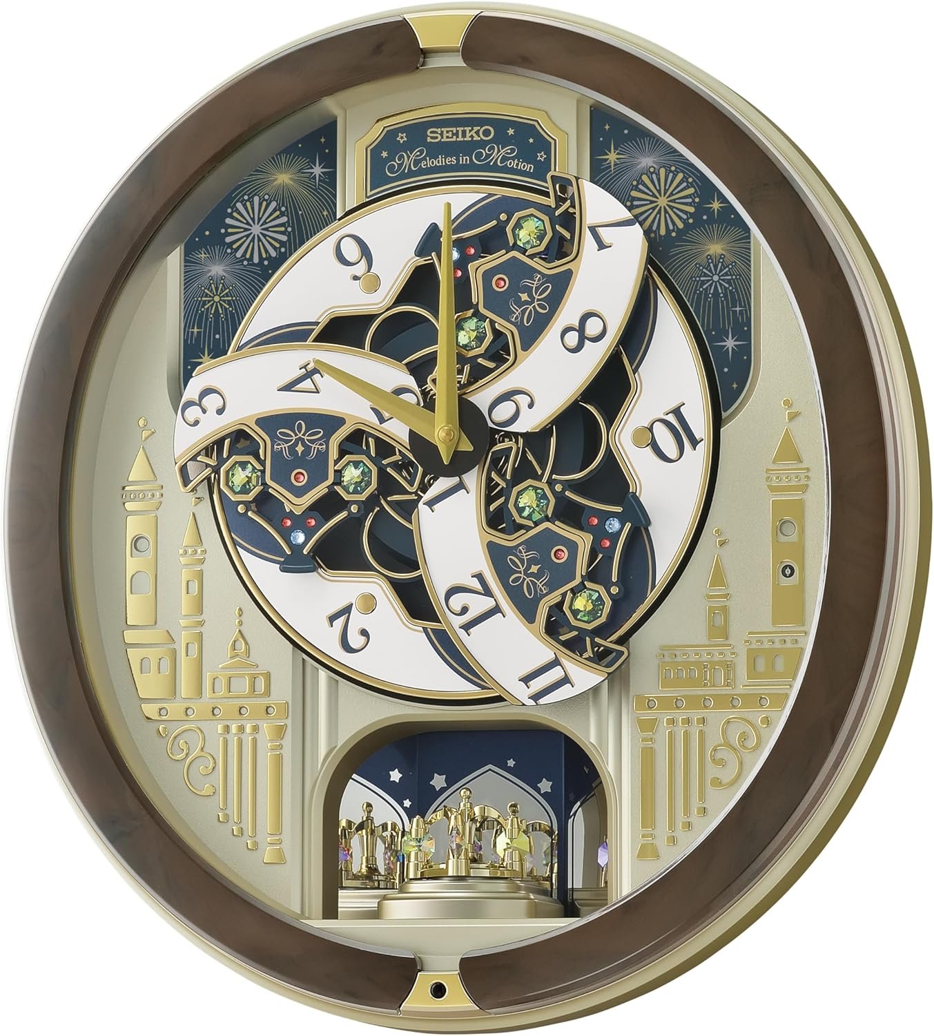 Sold exclusively at Sam’s Club, the 2024 Melodies In Motion “Concert Hall” will evoke years of precious family memories with each song played. This year’s clock is a spectacular showcase of fireworks in the night sky over a golden city scape. Experience the magic all year round of colorful fireworks. Melodies In Motion by Seiko is a whimsical musical clock which plays one of 45 high-fidelity melodies every hour while the dial on the face opens and spins. This year’s clock is adorned with 22 Preciosa crystals which sparkle and twinkle in the light. The frame of the clock is a faux brown marble design to fit into any decor. The light sensor ensures that the clock stays quiet in the dark. Enjoy this clock all year long with its 15 classical music box melodies, 10 holiday melodies and 20 all classic crystal bell melodies. The rotating pendulum adds sparkle and shine with each Preciosa Crystal precisely placed for optimum delight. Measuring 17.50 X 16 X 3.75 inches this spectacular wall clock will add beauty to any space. All Seiko clocks are equipped with crystal quartz movement making it the most precise in time keeping. Powered by 4 “C” batteries, included. This clock is perfect for any age to adult.