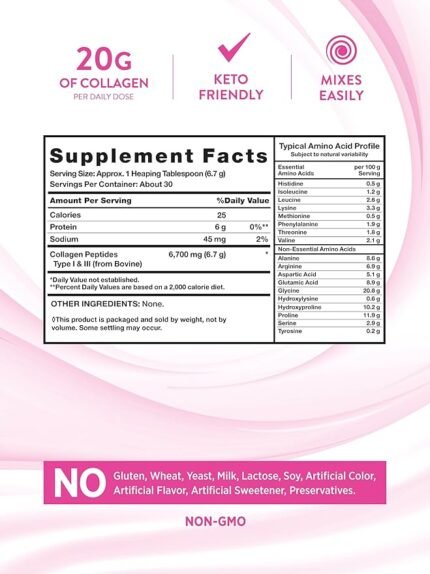 • Provides 20 grams of Collagen Type 1 and 3 per daily dose